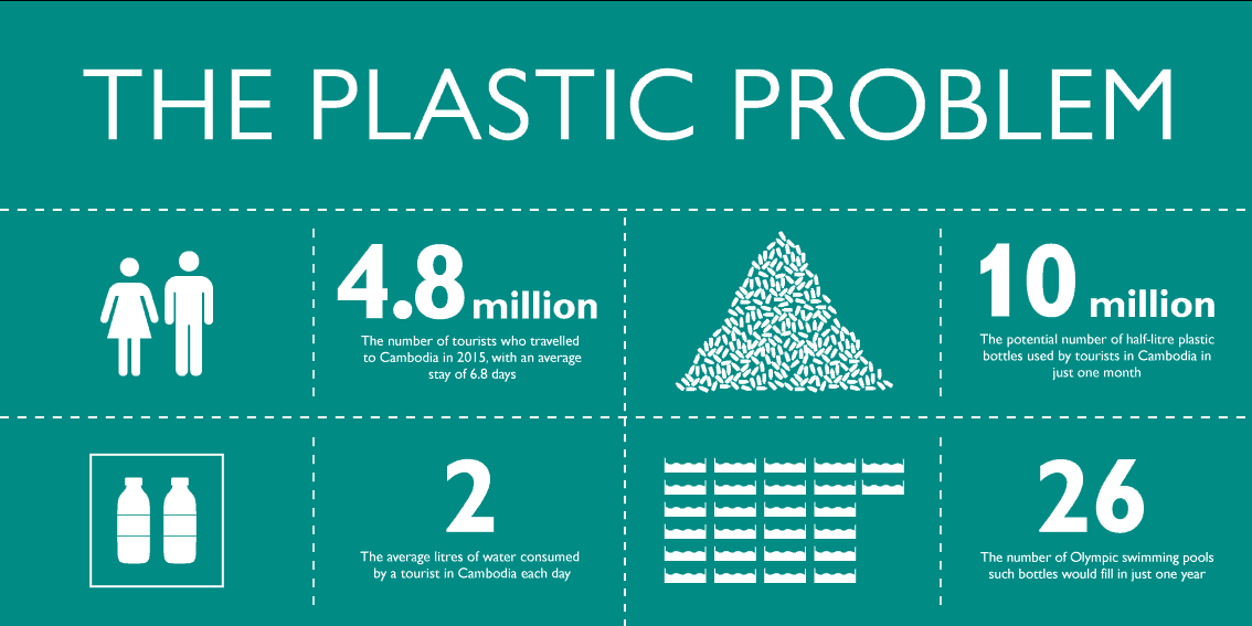 Million visitors travelled to Cambodia, staying for an average of 6.8 days. Each visitor consumed around 2 litres of water per day, which amounts to more than 10 million half-litre single-use plastic waters bottles, in just one month! That is a staggering 355,000 bottles per day, or almost 130,000,000 bottles per year. Can you imagine 26 Olympic-sized swimming pools full of plastic water bottles, every year? But, there is another way…