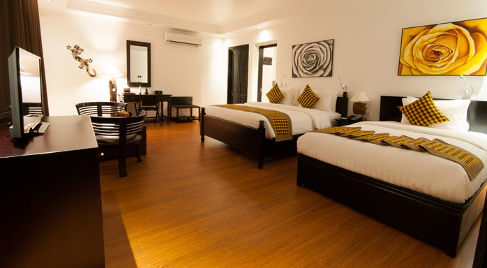 Each of the 68 spacious, non-smoking rooms and suites were designed with elegance and comfort in mind. While many suites overlook our lush tropical garden and salt-water swimming pool and separate kid pool, each stunning room features a large bathroom equipped with powerful rain shower and separate bathtub, makeup/shaving mirror, high ceilings, electronic safety deposit box, tea and coffee making facilities and a warm comfortable ambiance designed for a more relaxing sojourn. There are one-bed room and two-bed room apartment suites which feature separate kitchen. Locally designed and traditionally styled furniture and amenities are fused with a unique interior décor utilizing natural elements giving the room an air of sophistication. Room sizes range from 45sqm to 120sqm.